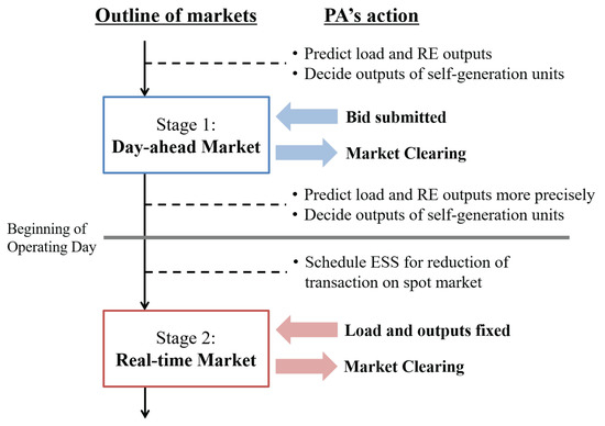 Of the several types of multi-period markets, this study focuses on the following two-period energy markets: a DAM and an RTM. Figure 1 shows the market scheme and the PA’s action in each step. First, on the day before the operating day, bids are submitted to the DAM before the DAM and RTM prices and the RE outputs become known. Second, the DAM is cleared based on bidding curves by the beginning of the operating day (usually around noon on the day before). Third, RE outputs are committed just before the RTM is cleared at each hour, and PAs decide on their schedules of self-generation and the charging/discharging of their ESSs in order to supply the demand. Fourth, PA imbalances are settled after the RTM is cleared.