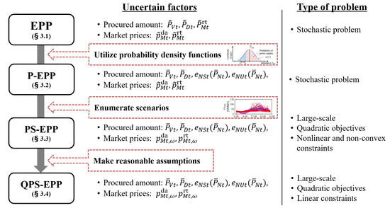 Figure 2. Procedure to transform and relax the energy procurement problem (EPP). P-EPP, probabilistic EPP; PS-EPP, probabilistic and scenario-based EPP, QPS-EPP, quadratic probabilistic and scenario-based EPP.