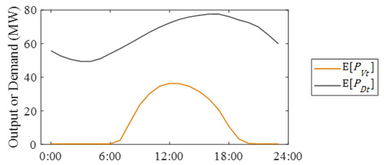 Based on the formulation of the EPP, probabilistic indices are employed to evaluate the uncertainties. The modeling targets in this section are P ˜ V t and P ˜ D t in order to quantify the expectations of purchasing/selling electricity on an RTM. In order to simplify the modeling of the indices, we assume that the PV output and the demand for 1 h follow a Gaussian distribution. The use of other probability distributions is reserved for future work.