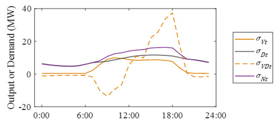 where σ V t , σ D t and σ V D t indicate the standard deviations of P ˜ V t and P ˜ D t and the covariance between P ˜ V t and P ˜ D t , respectively. Here, the standard deviations of the imbalances are simply parameters, because they do not include any decision variables.