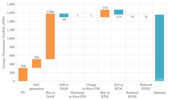 Previous studies have modeled players who procure electricity from multiple sources, such as load-serving entities [2,7], electric retailers [4,5,8,15] and large consumers [3,6]. We model such a player as a “procurement agency (PA),” without loss of generality. As in other models, PAs supply electricity for contracted demand by procuring from multiple sources, such as bilateral contracts and self-generation. In this study, a PA has the following sources of electricity: transactions in DAMs and RTMs, self-generation, PVs and ESSs in an area. The capacity of each option is given, except in the case of ESSs. Moreover, it is assumed that a PA is a price-taker in the markets, which means its behavior has no impact on market prices.