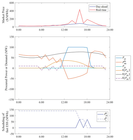 where r dis and y E are the discount rate and the useful lifetime of the ESS (in years), respectively, and 8760 corresponds to τ × 365 . The second term in Equation (1) indicates the operational cost of self-generation units, such as thermal power plants. Here, P G k , t denotes the output of the k-th conventional generator, running from one to n G , and p G n , k is a polynomial coefficient of the n-th term in the fuel-cost function of the k-th generator. The fourth and fifth terms denote purchasing/selling electricity on a DAM and an RTM at time t ( P M t da and P M t rt , respectively), at market prices p ˜ M t da and p ˜ M t rt , respectively. Here, P M t da and P M t rt refer to purchased power if positive and sold power if negative.