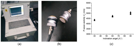 | β (°) | Sample No. | Diameter (mm) | Height (mm) | Bulk Density (g/cm3) | P-Wave Velocity (m/s) |