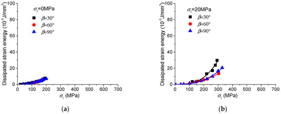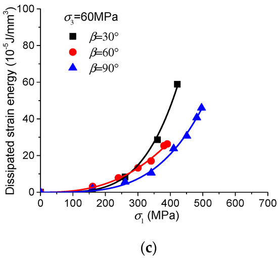 - These behaviors of strain energy dissipation are closely related to the different fracturing patterns of the samples under different loading directions and confining pressures. Generally speaking, the formation of extension fractures dissipates less strain energy, while the coalescence of shear fractures and the friction on the fracture surfaces dissipate much more strain energy. For the slip along the weak planes with a low friction angle, the dissipated strain energy is also limited. The different characteristics of strain energy dissipation are related to the corresponding fracturing patterns.