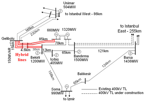 Single-line diagram of the Southern Marmara Sea 400 kV network (hybrid lines Gelibolu–Berkili are highlighted in red).