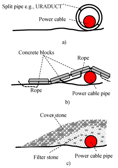 When suitable subsea burial tools (e.g., jetting, trenching, and dredging machines) became available in the 1980s, the burial and covering protections of more and more longer cable stretches became a common engineering practice. However, in 1986, only a small portion of submarine power cables was externally protected [24]. Today, almost all submarine power cables are externally protected by burial or covering (e.g., by means of mattresses or tubular products, or rock dumping) (see Figure 4 and Figure 5).