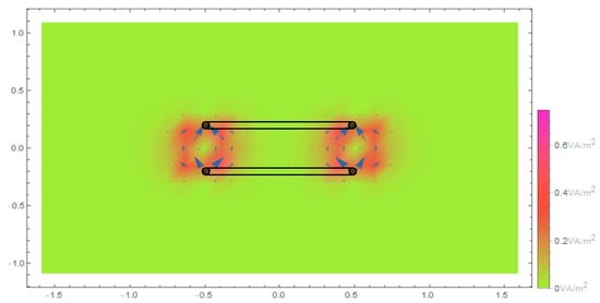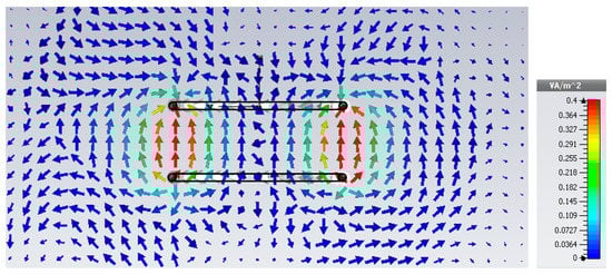 It can be seen from Figure 2 and Figure 3 that most Poynting vectors between the coupled coils point from the primary coil to the secondary coil. It also shows most power distributes between the two edges of coils instead of focusing along the center axis. As the system is symmetrical, in a three-dimensional (3D) domain, the power density distribution would be in a donut shape between and along the perimeter of the two coils. The magnitudes, directions, and distribution of the Poynting vectors of shown in Figure 2 and Figure 3 are in good agreement. Figure 2 shows the maximum values of the Poynting vector fields are around 0.4 VA/m2, according to the results and Figure 3 shows almost the same amplitudes of the time-averaged Poynting vector, which validates the correctness of the proposed analytical Poynting vector model.