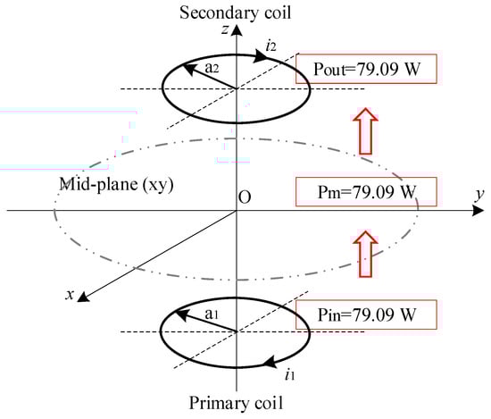 Equation (15) shows the surface integral of the perpendicular Poynting vector components is equal to the power transferred from the primary to the secondary. The power transferred across the mid-plane is determined by the system frequency, the radii of the primary and the secondary, the RMS values of two coil currents, the phase between two currents, and the coupling distance. The result is consistent with that from the circuit theory of [18]. Note the xy plane is chosen here as the mid-plane to simplify the calculation, and it is possible to verify that the Poynting vector method in relation to the average power flow applies to any infinite surface perpendicular to the axis between the two coupled coils.
