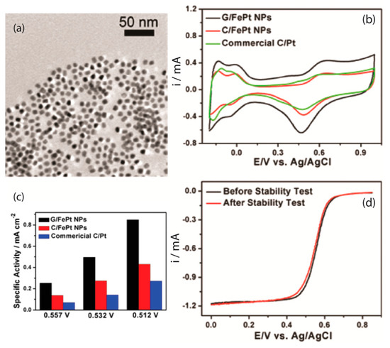 Figure 1. (a) TEM image of the Fe58Pt42 NPs assembled on the graphene surface. (b) Cyclic Voltammograms (CVs) in N2-saturated 0.1 M HClO4 solution. (c) ORR specific activities of the G/FePt, C/FePt, and commercial C/Pt catalysts. (d) ORR polarization curves of the G/FePt NPs before and after 10,000 potential sweeps (reprinted from [43] with permission from the American Chemical Society. Copyright 2012).