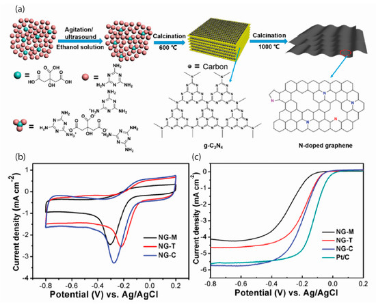 Figure 2. (a) Proposed synthetic protocol for N-doped graphene. (b) CV plots of NG-M, NG-T, and NG-C. (c) LSV curves of ORR on NGs and commercial Pt/C at a scan rate of 5 mV/s at 1600 rpm. (Reprinted from reference [50] with permission from the American Chemical Society. Copyright 2015).