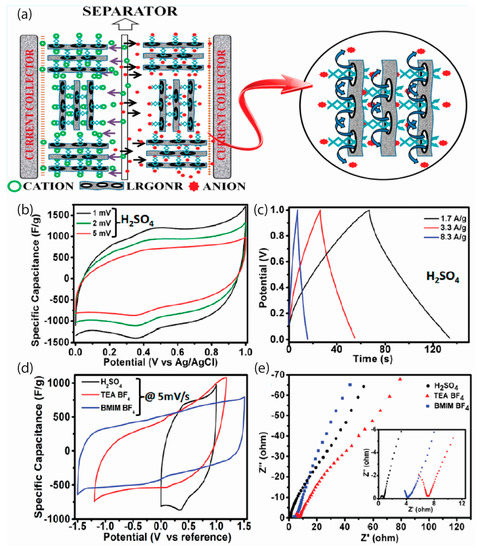 Figure 3. (a) The schematic drawing of a supercapacitor made of LRGONRs. (b) CV of LRGONR in 2 M H2SO4. (c) LRGONR galvanic charge-discharge. (d) Comparative CVs of LRGONR in 2 M H2SO4, 1.0 M TEA BF4, and 1.0 M BMIM BF4/AN. (e) Corresponding Nyquist plot of LRGONR (reprinted from reference [68] with permission from the American Chemical Society. Copyright 2015).