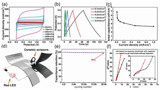 Figure 4. (a) CV curves of the TGS under different scan rates. (b) GCD curves of the TGS with various current density. (c) Schematic illustration of the shape-tailorable supercapacitor. (d) Areal and volumetric capacitances of the TGS with different current densities. (e) Capacitance retention for the TGS that has undergone 20,000 cycles. (f) Nyquist plots of the TGS without separator and the aqueous-electrolyte-based supercapacitor with a separator. The inset in (f) is magnification of the high-frequency region (reprinted from reference [72] with permission from the American Chemical Society. Copyright 2015).