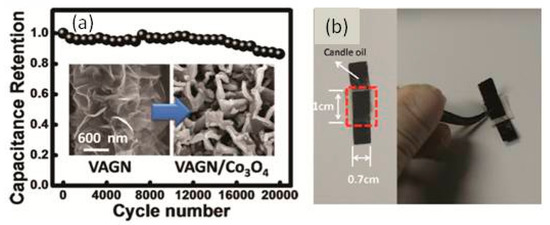 Among transition metal oxide candidates, Co3O4 possesses some intrinsic properties that enable it to be an ideal supercapacitive material, such as high theoretical specific capacitance value (3560 F/g), environmental friendliness, and good electrochemical performance. However, the large-scale application is hindered by the observed low specific capacitances in practice and low electronic conductivity of Co3O4. Graphene nanosheets (GNSs) are an excellent support to host Co3O4, because of their outstanding feature of high conductivity and specific surface. Even though GNSs have its intrinsic drawback of restacking because of π-π interactions and the van der Waals force, it could be solved by employing a vertically aligned graphene nanosheet (VAGN) with its bottom fixed to the surface of the substrate, maintaining the space between graphene nanosheets. Furthermore, more space in the GNS makes the internal resistance lower and electrolyte is easier to reach the inner part of electrode. Wang et al. used Co3O4 NPs deposited on the VAGN to make a novel supercapacitor (Figure 5). The VAGN is used for the backbone working with carbon fabric. In electrochemical performance testing, Co3O4 achieved a high specific capacitance of up to 3482 F/g as well as the highest energy density up to 80 Wh/kg. The highest power density was also recorded up to 20 kW/kg. Even though the device was bent to 150°, it still showed a good electrochemical performance with excellent flexibility. 86.3% of the capacitance retention was recorded when 20,000 cycles at 20 A/g are done [78].