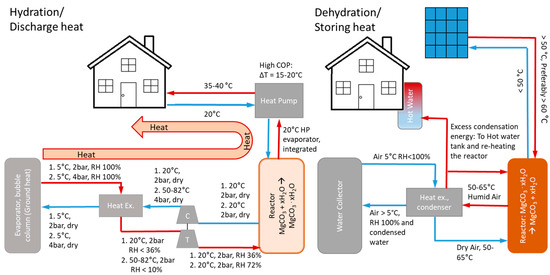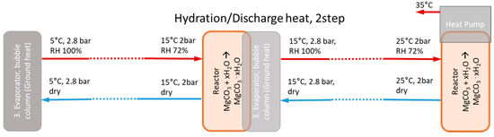 When the heat storage step takes place, dehydrating NQ and SG in the reactor, it releases large amounts of water, resulting in humid air, which is partly condensed in a heat exchanger with the water being collected in a water tank, while the remaining dry air is sent back to the reactor, according to Figure 1. The condensation heat can be re-used for dehydration or for producing hot water if needed. In the heat-discharging step, the water tank located underground uses ground (geothermal) heat for evaporating water, which can be used for hydration of MgCO3 and SG in the reactor. The reactor gives an operating temperature of 15–25 °C, which requires a heat pump to increase the temperature to 35 °C for its usage in a modern house heating system. The low temperature rise in the heat pump would give approximately double the COP (coefficient of performance) compared to a normal ground heat pump, operating with the double temperature difference from 5 to 35 °C, which also decreases the investment cost of the compressor. The yearly average COP of a ground heating system in the Nordic countries is typically between 2.8 and 5, depending on the type and manufacturer [17]. Moreover, this system would give an extra advantage compared to air heat pumps for outside temperatures below 0 °C. In houses using solar heat, the stored heat can be used during night, or during ambient winter when temperature is e.g., below 0 °C, decreasing the required heat pump capacity. In larger houses or larger district heating systems, the usage can be centrally controlled, as more heat sources in district heating are close to the user.
