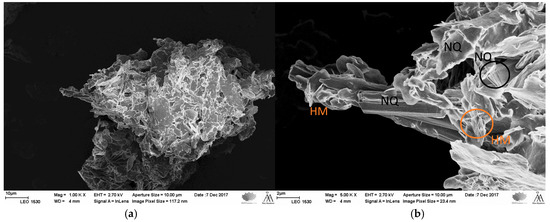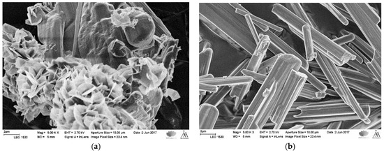 According to others, NQ are needle shaped crystals (e.g., Figure 3a) and hydromagnesite (HM) is irregular flakes that in (e.g., partly in Figure 3b), which makes it of interest to analyse the crystals’ appearance using SEM pictures [21,22].