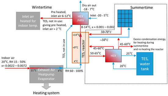 Presumably, the formation of hydromagnesite occurs at high temperatures during dehydration, and hydration without excess CO2 is possible without losing cyclability. This is why a simpler (less expensive) concept is also presented, without excess CO2 during hydration. TES coupled with an exhaust air heat pump (EAHP) was developed, shown in Figure 4. TES using water vapour from the indoor air, of which heat is used for the EAHP and is chilled down to 4 °C, giving a suitable 60–100% RH for the hydration of NQ and SG is shown in the scheme in Figure 4. The temperature rises by 5–10 °C, depending on the available content of water vapour (giving heat when reacting with NQ mixed with SG according to R1) per mass air heated air. This is used for preheating the inlet air, and less energy for heating inlet air is then demanded from the heating system. Basically, the water vapour source for chemisorption is excess moisture from indoor activities (shower etc.) and the outdoor air, considering that the outlet air is drier than the inlet air (due to the water vapour adsorption in the TES).