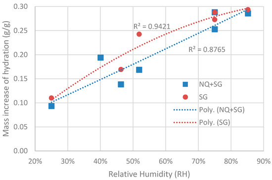 Noticeably, the mass increase of NQ+SG and SG reference samples give fairly similar results in terms of mass increase at RH 75%, while at RH 40–52% the SG seems to hydrate considerably more than the NQ+SG mixture. This suggests that NQ incorporates less water vapour than SG at RH 40–52%. The theoretical maximum for reaction R1 is 0.64 g/gsample and, approximately 0.35 g/gsample for water trapped in SG, if heated to 105 °C. The best result of this sample NQ+SG obtained the same mass increase as the reference SG and assuming both components hydrating equally well, gives a calculated heat storage capacity of 0.49 MJ/kg.