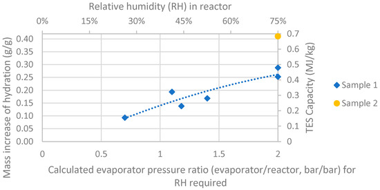 The work required for the generation of water vapour, according to Figure 1, would approximately give a COPTES of 2–4 depending on whether a pressure of 1.41 or 2 bar is used in the evaporator and the reactor, as shown in Table 3. However, the COPTES can be improved by two different methods. Firstly, increasing the total pressure in the system, giving a larger absolute humidity, decreases the amount (mass) of compressed gas per mass water vapour [25]. Increasing the reactor pressure to 2 bar gave a slightly better hydration test result of 0.293 g/gsample mass increase, giving a storage capacity of 0.49 MJ/kg, as shown in Table 2. Figure 9 shows that at a higher pressure both the dehydration and hydration reactions will take place at slightly higher temperature, according to Gibbs free energy calculations. Secondly, coupling two circuits in series, decreasing the temperature difference in each individual circuit, leads to decreased requirements for water vapour generation at lower temperatures according to the results shown in Table 3. A smaller temperature difference between the evaporator and the reactor requires a lower pressure in the evaporator for a certain RH in the reactor and requires less compressor work.