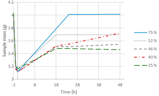 Shown in Figure 7, the hydration time is not significantly affected by the lower RH, considering the hydration levels reached after 18 h are close to, or similar to the final value of mass increase. However, in the test with 40% RH, a mass increase from 0.14 to 0.19 g/gsample was obtained between 24 and 48 h. This indicates that the kinetics of the TES system will not be compromised while operating at lower RH, as a large fraction of the hydration is possible with at lower RH in reasonable time. In case of day/night heat storage, several days of hydration may take place, considering that cloudy or stormy days may give much lower amounts of solar heat.