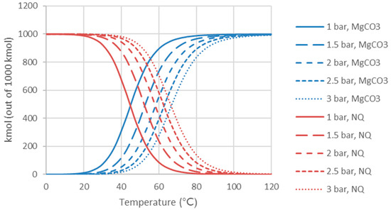 Our recent studies have shown that at temperatures of 50–65 °C the dehydration (charging heat by releasing crystallization water) of NQ, forming MgCO3 is possible for TES system purposes. For hydration of MgCO3, discharging heat, temperatures as low as 5–25 °C have shown to be suitable [13]. This reversible reaction can be used for a TES according to Figure 1. Obviously, any heat source with a temperature of at least 50 °C is suitable for charging the system (i.e., dehydration). However, to take advantage of the system, heat sources not meeting demand by the hour should nonetheless be used, as both given in Figure 1. Therefore, solar heat and district heat using primarily renewable energy sources are the obvious heat sources, but excess heat from the cooling of houses or other buildings could also possibly be used if its temperature is above 50 °C.