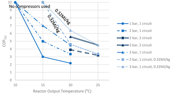 The COP of the TES system (COPTES) was calculated as the total heat output Qtot (including the excess heat from the compressor train and the reactor heat output) divided by the electricity required for the compressor according to Equation (1).