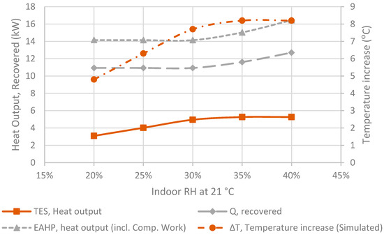 The heat effect of the TES reactor giving a temperature increase depending on the water vapour available are shown in Figure 12. The heat output of the TES would be 22–32% of the EAHP, depending on the RH of the indoor air. In the calculations, the RH of the output air from the reactor is 25% at the temperature of 4 °C (output temperature from EAHP) + ΔT, temperature increase (in the reactor).