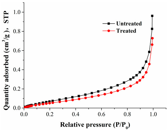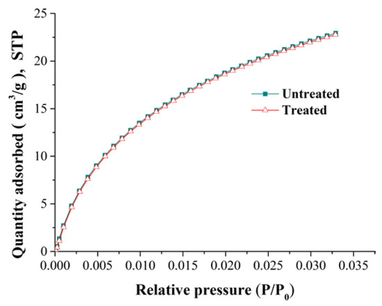From Figure 2, the adsorption curves of carbon dioxide in ice water (273 K) for the untreated and treated coal samples were basically the same. Figure 3 shows that the adsorption curve of argon decreased slightly at 87 K for the treated coal sample, which shows that the pore structure of the coal samples has changed.