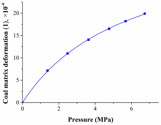 Figure 6 shows that, with the decrease in equilibrium pressure, the coal matrix shrinkage deformation decreased in a logarithmic manner, mainly caused by methane desorption. The relationship between the coal matrix deformation and the pressure can be expressed as