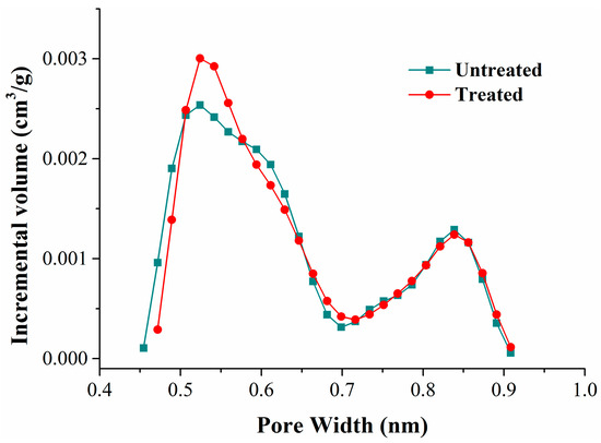Table 6 shows that the pore volume and specific surface area between 0.4720–0.9084 nm increased slightly after methane and nitrogen adsorption. Compared with the pore volume distribution curves (Figure 8), we found that the pore volume variation mainly focused on pores less than 0.6 nm in width. The pore diameter of pores less than 0.5 nm in width enlarged, and the pore volume of pores between 0.5 and 0.6 nm in width increased.