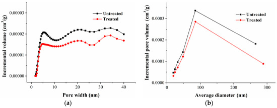 Table 7 shows that the pore volume and specific surface of mesopores and part macropores (2–250 nm) decreased slightly after methane and nitrogen adsorption. The pore size distribution curves of the pore volume of coal samples before and after gas adsorption showed that the pore volume of mesopores and part macropores declined slightly (Figure 9). The increment of pore volume and specific surface area in the micropores obviously exceeded the reduction of pore volume and specific surface area of the mesopores and part macropores.