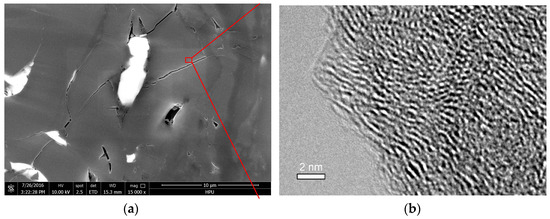 The micropores, mesopores, and macropores in the coal matrix were observed using HRTEM (JEOL Ltd., Tokyo, Japan) and FE-SEM (FEI Company, Hillsboro, OR, USA). Figure 10a is an FE-SEM image of the mesopores and macropores, and Figure 10b is a TEM image of the micropores. The vast majority of gas was absorbed on the surface of micropores, then the gas molecules desorbed and moved through the mesopores and macropores for release in CBM production. When the gas molecules absorbed on the micropore surface, the micropore volume increased, which led to the coal matrix swelling. We detected a residual micropore volume increment of 0.0006760 cm3/g. Meanwhile, the mesopore and macropore volume decreased due to the coal matrix swelling. The residual reduction was about 0.0002286 cm3/g, which was less than significant in terms of the micropore volume increment. The coal matrix deformation caused by gas adsorption was very small, and only a fraction of the deformation remained after the gas adsorption experiment. Therefore, the pore volume variation that we detected was very tiny, and some deformation in the macropores and cleat could not be determined by the argon adsorption experiment.