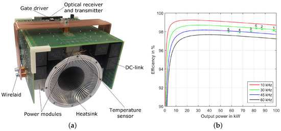 Inverter design for EPHLS and efficiency calculation. (a) reference inverter design with 100 kW [8]; (b) inverter efficiency for the six advanced high-lift systems and different switching frequencies from 10 up to 60 kHz.