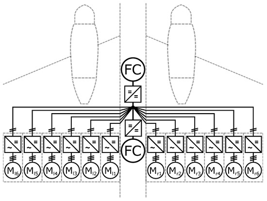 For the power distribution grid with batteries or fuel cells, the cables are redesigned and the resulting cable mass is summarized in Table 4. Here, two different concepts are compared: Concept a is a central, redundant system shown in Figure 5 with two fuel cells or batteries and two DC–DC converters. In this case, the cable mass summarizes to 38.9 kg with 34.5 kg DC and 4.4 kg AC transmission lines. Concept b is modularized into eight fuel cells/batteries of 204 kW (typical module size for busses) and eight DC–DC converters. This shrinks the cable cross section area required for every conductor, but increases the number of cables. For this approach, a total cable mass of 39.2 kg results with 34.8 kg DC and 4.4 kg AC transmission lines, which is comparable to Concept a. Since the cable masses of both concepts are comparable, a further detailed modelling of the distributed energy supply from the cable perspective is therefore not required in this paper.