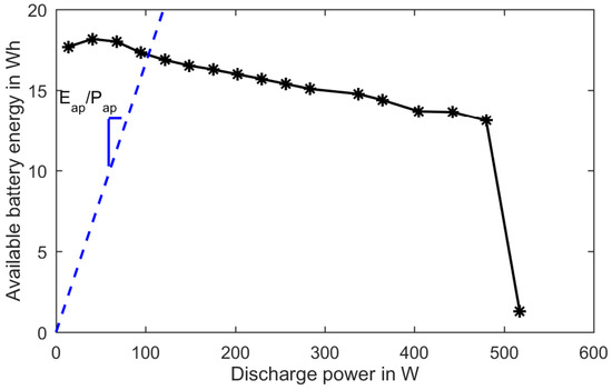 Figure 6 shows the available discharged energy in dependency of the load power, holding all operating parameters, such as minimal voltage and maximum current (see Table 5). In this diagram, the application requirements can be represented via a line with the slope of the needed energy divided by the required power ( in h). The most useful design point of the energy storage is its intersection with the measured data, resulting in the corresponding available energy of a single cell at a certain power. The necessary number of cells is determined via