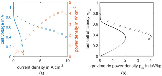 Characteristic curves used for the fuel cell design employing current and future fuel cell technology. Lines are simulations of the experimentally-fitted model of Kulikovsky [24] (current technology); dashed lines mark the region after the maximum power point, which is not recommended for operation due to reduced efficiency. Crosses are experimental values of [28] (future technology of 2035). (a) polarization and power curves of the present (solid) and future (crosses) fuel cells; (b) efficiency-power density curves of the present (solid) and future (crosses) fuel cells.