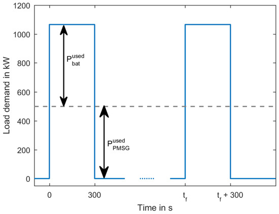 For the design case, the full power needs to be provided for 300 s for take-off as well as for landing. The resulting load demand profile is shown in Figure 10.