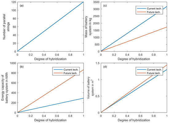 Influence of degree of hybridization for current (blue) and future technology in 2035 (red) on (a) number of parallel strings for current technology; (b) energy capacity of battery systems; (c) mass of battery systems; (d) volume of battery system.