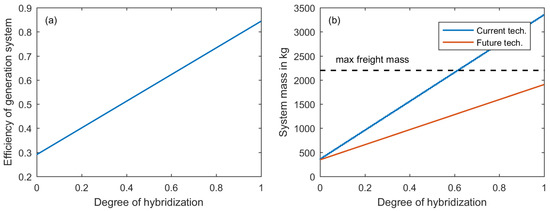 For each possible degree of hybridization , the battery design is performed as described in Section 2.2. For the current technology, a single cell can provide 103 W and 17.2 Wh at the design point displayed at Figure 6. The cells will be connected, such that the input voltage of the DC–DC converter is as near as possible to the DC link voltage, which is designed with 600 V. Therefore, is 600 V, as well. For the current technology, there are 142 cells connected in series due to the nominal voltage of the DC–DC converter of 600 V (Equation (4)). The cells are combined in units called modules. For the design of the battery management system and other peripheral components, the single modules should be equal. Therefore, the number of serial cells is reduced to 140, such that, in each module, 10 cells are connected in series and then 14 modules are combined in one battery rack. Overall, this results in a maximal battery voltage of 588 V, a minimal voltage of 378 V and a nominal voltage of 518 V. The number of parallel cells depends on the degree of hybridization and is shown in Figure 11a (blue line). According to Equation (5), for a pure battery system (), 120 cells in parallel are necessary to provide the required energy. This results in an energy capacity of nearly 290 kWh (Figure 11b). The design is clearly limited by the power density and not by the energy density of the cells.