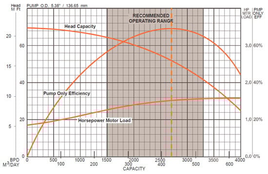 The electrical submersible pump (ESP), as a high-efficiency downhole equipment for converting kinetic energy to hydraulic pressure head, has improved significantly since it was invented in the 1910’s by the Russian engineer Arutunoff. Globally, there are more than 100,000 ESP installations, making ESP the second most widely used artificial lift method in oil production, but the first based on the produced amount [,]. ESPs excel in producing crude oils at very high flow rate, but they have to be operated within a narrow application window. Gas involvement, changing production rate and high oil viscosity can greatly affect the ESP performance [,].