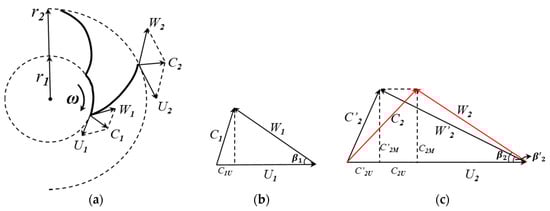 where C1U and C2U are the projection of absolute velocities at the impeller inlet and outlet to the direction of peripheral velocities. Applying the velocity triangle relationship in Figure 3, one can obtain: