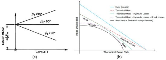 Figure 4a shows the change of the ideal Euler head with the outlet blade angle β. Figure 4b shows the losses to the ideal head and the final H-Q curve of a centrifugal pump according to Equation (7). Friction loss becomes prominent at high flow rates. In contrast, leakage loss is more at relatively low flow rates. Shock loss takes place when the liquid flow rate differs from the designed flow rate. Table 1, Table 2, Table 3, Table 4 and Table 5 below discuss each pressure loss mechanism by presenting existing models that are available in literature.