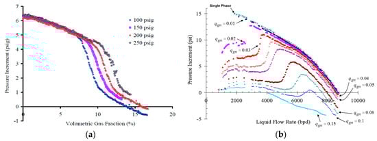 A typical testing result of ESP two-phase performance with pure water-air flow is shown in Figure 5 [], including surging (Figure 5a) and mapping tests (Figure 5b). For surging test, the liquid flow rate is fixed, but gas flow rate or inlet gas volumetric fraction (GVF) varies. On the contrary, the liquid flow rate changes while the gas flow rate is fixed in mapping test. In Figure 5a, different curves correspond to different pump intake pressures. Obviously, the pump pressure increment declines non-linearly with the increase of inlet GVF. For mapping test results in Figure 5b, each curve corresponds to a different gas flow rate, which increases from the top to bottom curves. With a fixed gas flow rate, a sudden drop of pump stage pressure increment is observed when flow rate is reduced to a certain value.