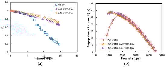 However, the studies on the surfactant effect on centrifugal pump performance under two-phase flow conditions are few. Zhu et al. [] measured the ESP two-phase pressure increment with/without surfactant injection in the flow loop. The surfactant used in their study is isopropanol alcohol (IPA). The decline trend of normalize pressure (Np) in Figure 6a versus the intake GVF improves with surfactant injections, and the pressure surging phenomenon depicted by a sudden drop of ESP boosting pressure disappears. Figure 6b compares ESP H-Q performance curves under air-water flow with different IPA volumetric concentrations. A clear difference can be seen at low QL in terms of the stage pressure increment. Without IPA injection, the pressure increment drops to zero if QL becomes very low. But, the ESP performance improves significantly with surfactant presence.