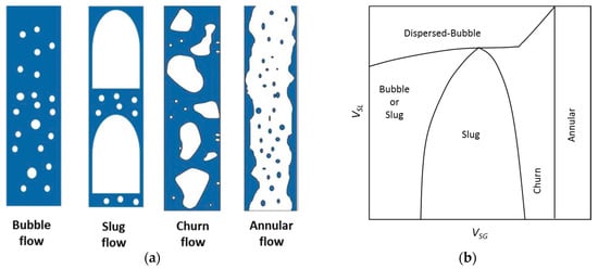 In multiphase pipe flow, flow pattern varies due to phase interaction and interfacial momentum transfer changes, which depend on fluid properties, flow rates and pipe geometry. Many studies on the recognition of flow patterns and their transition boundaries are available in literature [,,]. Flow pattern is important to accurately predict the liquid holdup and pressure gradient in pipe flow. Take the upward gas/liquid flow in a vertical pipe for example, the main flow patterns are bubble, slug, churn and annular flows as illustrated in Figure 7a. Correspondingly, the flow pattern map showing the transition boundaries between different flow patterns is plotted in Figure 7b with the superficial velocities of gas and liquid as its coordinates.