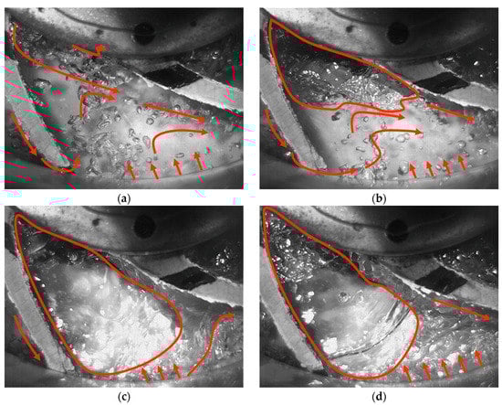 Verde et al. [] conducted visualization experiments on flow pattern recognition inside a rotating ESP impeller using high speed and resolution imaging technique. As shown in Figure 10, four different flow patterns were classified, including bubble flow (Figure 10a), agglomerated bubble flow (Figure 10b), gas pocket flow (Figure 10c) and segregated flow (Figure 10d). They observed that the intensity of pump performance degradation is directly influenced by the flow pattern within the impeller. The occurrence of the gas pocket flow pattern is linked to the intensification of the deterioration of pump performance and the appearance of operation instabilities. Moreover, the segregated flow patterns correspond to the severe performance degradation which makes the pump incapable of generating pressure.