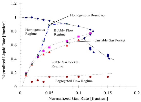 Similar as the gas/liquid pipe flow, Estevam [] and Estevam et al. [] categorized the flow patterns in a rotating ESP impeller as bubbly flow, transition flow, and elongated-bubble flow. A more thorough experimental study on flow pattern recognition of two-phase flow in ESP impeller was carried out by Gamboa [], Gamboa and Prado []. Under a given flow condition, the typical flow pattern map from their visualization experiments is shown in Figure 9, where the curves denoted by different symbols represent the transition boundaries between flow patterns, including homogenous flow, bubbly flow, gas-pocket formation, and segregated flow. Figure 9 is important to understand the two-phase flow mechanisms in a rotating ESP. From the perspective of mechanistic modeling, each flow regime corresponds to the specific governing equations for flow characteristics, such as bubble size (db), in-situ gas void fraction (αG), slippage velocity (Vslip) between gas and liquid phases. With the flow pattern prevailing inside a rotating ESP determined, the governing equations based on mass and momentum conservations can be simplified.