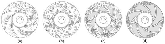 Impeller channel flow behavior at N = 600 rpm and QL = 174 bpd with various gas flow rates. (a) λG = 0.15%; (b) λG = 0.23%; (c) λG = 0.39%; (d) λG = 1.05% [].