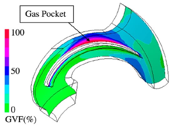 As the intake GVF increases, the tiny bubbles are prone to collide and aggregate to form bigger ones, resulting in bubbly flow regime. In contrast to homogenous flow regime, the phase slippage between gas and liquid, shown by Figure 11b can no longer be neglected. Thus, depending on the intake GVF, the in-situ αG under bubbly flow becomes higher than λG. A further increase of GVF induces more severe collision and aggregation of bubbles so that the large gas pocket forms. This flow pattern is similar as slug/churn flow patterns in pipelines, which are featured by a gas core/pocket followed by a liquid slug. As shown in Figure 11c, the Taylor-bubble-like gas pocket forms near the suction side of ESP impeller, which occupies a significant portion of the impeller flow passage.