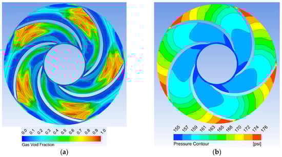 In Figure 8, λG denotes the intake GVF. It is evident that flow behaviors inside ESP impeller altered significantly with flow conditions. From Figure 8a,b, the GVF increase caused formation of larger bubbles and gas pockets, which in turn choked the flow passage for liquids and decreased the pump hydraulic head. Moreover, the flow patterns prevailing in ESP impeller at a specific value of λG, are comparable to that of gas-liquid two-phase flow in pipelines.