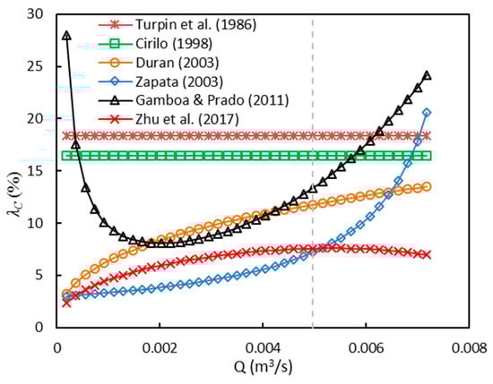 Sun and Prado [,,] claimed that the diffuser loss is caused mainly by the friction on the diffuser walls. Table 5 presents the calculation formulae of diffuser losses that were implemented in the prediction models. Most equations are similar to the friction loss formulae in Table 1.
